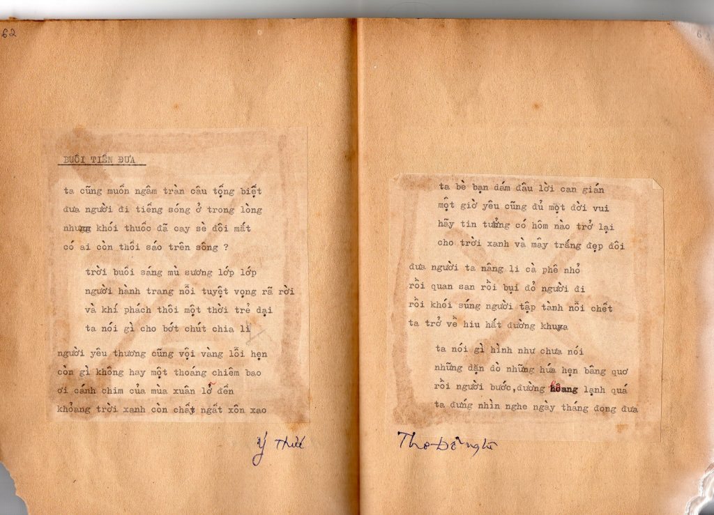 May thay, tôi còn giữ được bản thảo do Lữ Kiều gởi lại cho. Chuột gậm, mối nhấm, nhưng có hề gì! Bản thảo đánh máy trên giấy pelure mỏng, máy chữ Olivetti, cắt dán, phết keo phía sau thời đó trông cứ tưởng như bài thơ bị xóa.