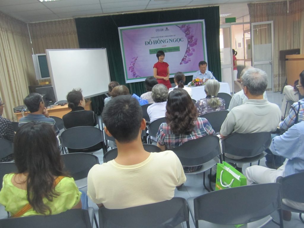 Đến Trung tâm lúc 9 giờ. Gặp BS Đỗ Hồng Ngọc và Cát Tiên trước tiên. Gặp lần đầu nhưng mình nhận ra anh ngay. Cũng sắp đến giờ mà khán phòng còn trống. Mình hơi lo lo vì lần đầu BS Ngọc nói chuyện ở Đà Nẵng mà mình có cảm giác là việc tổ chức thông tin có chút gì chưa ổn lắm. Nếu không tốt đẹp thì mình sẽ buồn lắm vì diễn giả là người mình quý và mong gặp từ lâu.