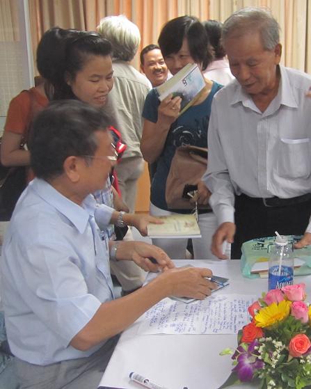Gặp Bs hôm rồi em thực sự vui, dù những gì minh trao đổi về « Một nếp sống hạnh phúc » không có gì xa lạ đối với em. Những gì Bs đề cập hôm đó em đều đọc nhiều lần trong các tác phẩm hoặc các bài viết cua BS trên các báo. Gặp Bs là mong muốn từ lâu của em, dù hôm đó em về quá trễ không kịp nấu cơm. Em mang sách Bs ký tặng và hình chụp cùng Bs khoe với hai đứa con, con gái của em năm nay 22 tuổi nói em rằng: « Me teen qua chừng, trốn đi làm bệnh viện, đi gặp idol xin chữ ký với lại xin chụp hình mới ghê chứ » . Em thấy đúng là mình trẻ con, nhưng lại thấy rất hài lòng. Em cảm ơn Bs vì tất cả những gì Bs mang lại cho em.