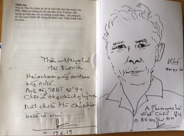 Mình bảo, anh tặng Chơn sách thì Chơn tặng lại anh dessin nhé. Rồi thì lấy bút của anh và lật trang bìa cuối ký hoạ nhanh. Anh PNL hiện ra vẫn lắng sâu, bi tráng của một “Biên Cương Hành”…