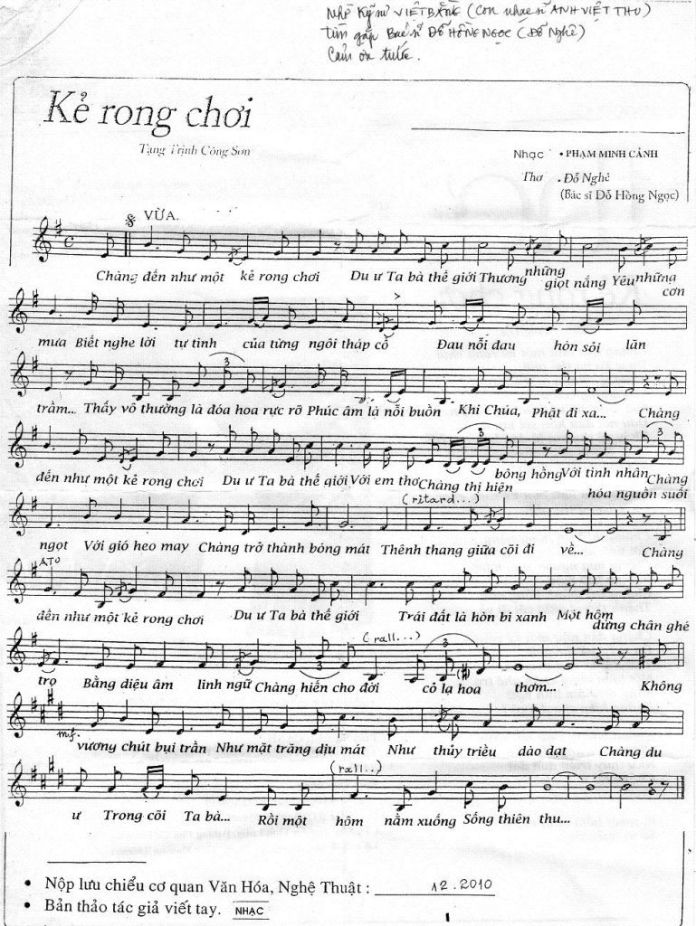 Dưới đây là bài Kẻ rong chơi, tặng Trịnh Công Sơn, thơ Đỗ Hồng Ngọc, nhạc Phạm Minh Cảnh. Bản nhạc được nhạc sĩ Phạm Minh Cảnh kẽ bằng tay rất đẹp.