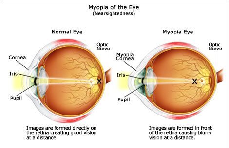 * Mắt bình thường thì ảnh của một vật ở vô cực sẽ hội tụ ở võng mô (không phải điều tiết), trong khi ở người cận thị, hoặc vì nhãn cầu lớn hoặc vì thủy tinh thể quá hội tụ, ảnh của vật đó sẽ nằm trước võng mô . Nguyên nhân một phần do di truyền như đã nói. Có em sinh ra đã bị cận rồi . Tôi đã thấy có những gia đình cả nhà đều bị cận mà những em bé mới 10 tuổi đã cãn trên 10 độ. Tuy nhiên, những người đọc sách quá nhiều trong điều kiện thiếu vệ sinh ( những con mọt sách) dễ bị cận thị hơn. Thực tế cho thấy những người gọi là “trí thức” … thường mắc tật cận thị, có lẽ vì quen nhìn một khoảng quá gần, đọc và viết nơi thiếu ánh sáng, tư thế và khoảng cách không đúng, mắt không được nghỉ ngơi, dễ mệt, yếu đi . Những người ở thôn quê, sống cảnh thiên nhiên ít bị cận thị, vì tầm mắt họ là chân trời xa thẳm, là đồng xanh bát ngát…